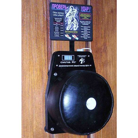 Рядом с прибором устанавливается транспарант (включён в комплект) с предупреждениями по технике безопасности и примерными значениями удара (женская пощёчина, мастер каратэ и др.)